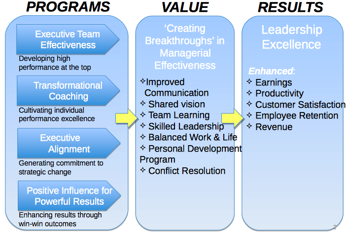 3 - Program Development The customized program developed for each customer is designed to overcome the weaknesses inherent in the current leadership group and to move it to the next level of performance. Among the considerations is the ability of the leadership team to communicate effectively with each other and their respective parts of the organization.